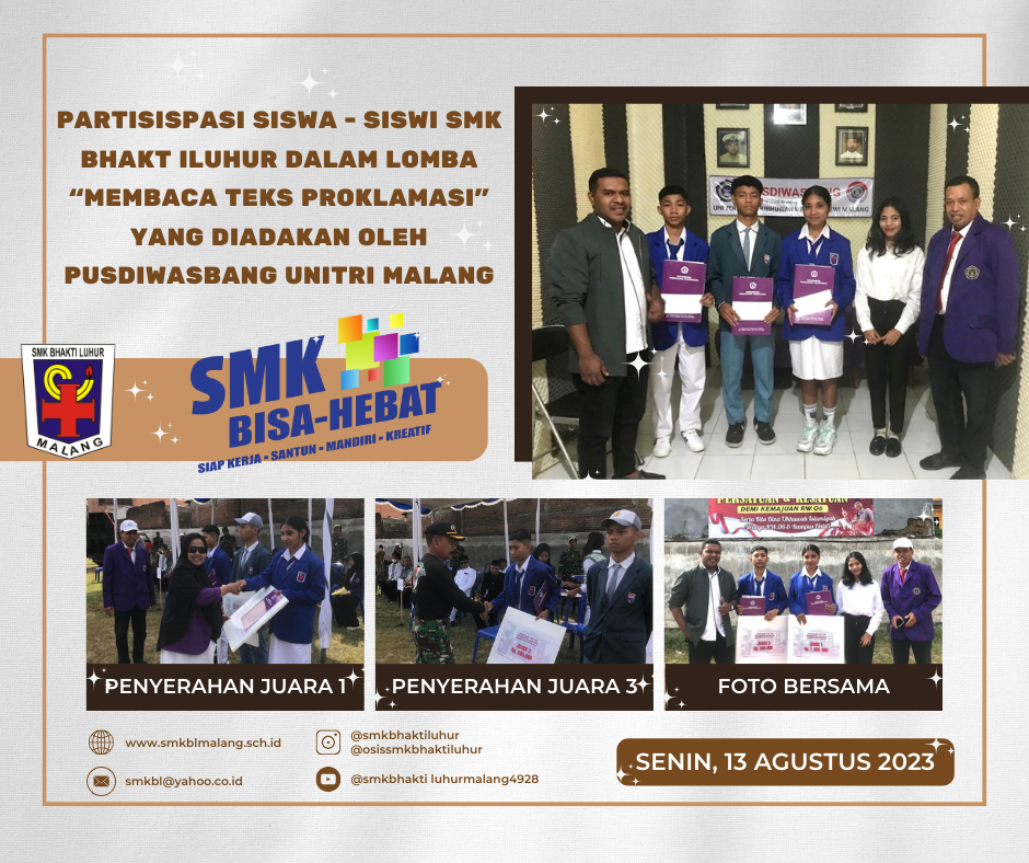 terima kasih untuk semua panitia beserta pendamping, yang senantiasa mendampingi siswa dan siswi SMK Bhakti Luhur sehingga mereka dengan semangat dan bangga mengucapkan TEKS PROKLAMASI sesuai dengan harapan pendiri bangsa, supaya teks proklamasi dan semangat perjuangan senantiasa berkobar di hati Siswa dan Siswi Smk Bhakti Luhur sehingga siswa siswi smk bhakti luhur dapat tekun belajar dengan lebih giat dan semangat demi mencapai cita cita di masa depan yang cerah dan bahagia. terima kasih pula kepada PUSDIWASBANG UNITRI MALANG yang telah menyelenggarakan lomba Membaca Teks Proklamasi ini, sehingga berjalan dengan lancar dan menjadi pengalaman baru untuk siswa dan siswi kami.